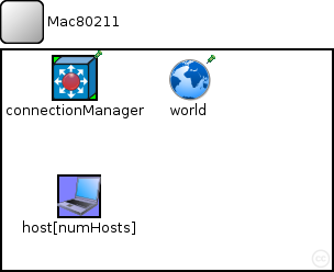 // //This example shows how to use MiXiMs 802.11 protocol implementation. // //The network consists of ten hosts broadcasting bursts of three packets //to the other hosts. When a broadcast is received a reply is sent back //to the sender. // //The hosts use "Mac80211" as MAC layer and their phy layer uses //"SimplePathlossModel" as AnalogueModel and "Decider80211" as Decider. //Note that Mac80211 and Decider80211 are always meant to be used //together. // //The default configuration in omnetpp.ini uses no propagation delay. // network Mac80211 { parameters: double playgroundSizeX @unit(m); // x size of the area the nodes are in (in meters) double playgroundSizeY @unit(m); // y size of the area the nodes are in (in meters) double playgroundSizeZ @unit(m); // z size of the area the nodes are in (in meters) double numHosts; // total number of hosts in the network @display("bgb=$playgroundSizeX,$playgroundSizeY,white,,;bgp=10,50"); submodules: world: BaseWorldUtility { parameters: playgroundSizeX = playgroundSizeX; playgroundSizeY = playgroundSizeY; playgroundSizeZ = playgroundSizeZ; @display("p=171,27;i=misc/globe"); } connectionManager: ConnectionManager { parameters: @display("p=66,25;b=42,42,rect,green;i=abstract/multicast"); } host[numHosts]: Host80211 { netwType = "BaseNetwLayer"; applType = "BurstApplLayer"; mobType = "ConstSpeedMobility"; } connections allowunconnected: // all connections and gates are to be generated dynamically }