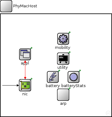 module PhyMacHost { parameters: double numHosts; // total number of hosts in the network @display("bgb=363,335,white;bgp=10,10"); gates: input radioIn; submodules: batteryStats: BatteryStats { @display("p=239,206;i=block/circle"); } battery: SimpleBattery { @display("p=171,206;i=block/control"); } utility: BaseUtility { parameters: @display("p=205,146;i=block/blackboard"); } mobility: BaseMobility { parameters: @display("p=205,81;i=block/cogwheel"); } arp: BaseArp { @display("p=205,264;b=30,25;i=block/process"); } appl: NetworkStackTrafficGen { parameters: @display("p=80,132;b=20,20,rect,white;i=block/app"); } nic: Nic802154_TI_CC2420 { parameters: @display("b=32,30;p=80,233;i=block/ifcard"); } connections: nic.upperGateOut --> { @display("ls=black;m=m,25,50,25,0"); } --> appl.lowerGateIn; nic.upperGateIn <-- { @display("ls=black;m=m,15,50,15,0"); } <-- appl.lowerGateOut; nic.upperControlOut --> { @display("ls=red;m=m,75,50,75,0"); } --> appl.lowerControlIn; nic.upperControlIn <-- { @display("ls=red;m=m,85,0,85,0"); } <-- appl.lowerControlOut; radioIn --> nic.radioIn; }