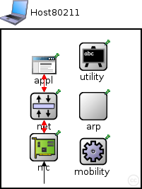 // // Example host module using an 802.11 Network interface card. // module Host80211 { parameters: string applType; //type of the application layer string netwType; //type of the network layer string mobType; //type of the mobility module @display("bgb=40,,white;i=device/laptop;b=40,40,rect"); gates: input radioIn; // gate for sendDirect submodules: utility: BaseUtility { parameters: @display("p=130,38;b=24,24,rect,black;i=block/blackboard"); } arp: BaseArp { parameters: @display("p=130,108;b=24,24,rect,blue;i=block/process"); } mobility: <mobType> like IBaseMobility { parameters: @display("p=130,172;i=block/cogwheel"); } appl: <applType> like IBaseApplLayer { parameters: @display("p=60,50;i=app"); } net: <netwType> like IBaseNetwLayer { parameters: @display("p=60,108;i=block/layer"); } nic: Nic80211 { parameters: @display("p=60,166;i=block/ifcard"); } connections: nic.upperGateOut --> net.lowerGateIn; nic.upperGateIn <-- net.lowerGateOut; nic.upperControlOut --> { @display("ls=red;m=m,70,0,70,0"); } --> net.lowerControlIn; nic.upperControlIn <-- { @display("ls=red;m=m,70,0,70,0"); } <-- net.lowerControlOut; net.upperGateOut --> appl.lowerGateIn; net.upperGateIn <-- appl.lowerGateOut; net.upperControlOut --> { @display("ls=red;m=m,70,0,70,0"); } --> appl.lowerControlIn; net.upperControlIn <-- { @display("ls=red;m=m,70,0,70,0"); } <-- appl.lowerControlOut; radioIn --> nic.radioIn; }