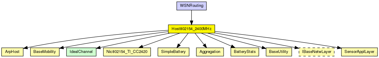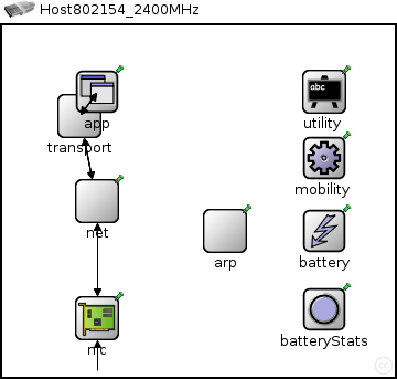 This NED module defines a host using an IEEE 802.15.4 transceiver at 2.4GHz for wireless communications, that can be used to simulate wireless sensor networks.
