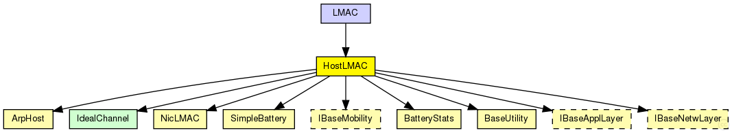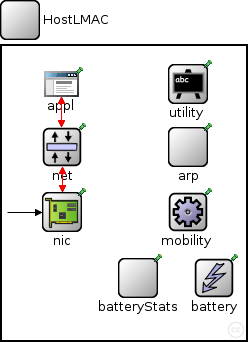 // // Example host module using a LMAC Network interface card. // module HostLMAC { parameters: string applType; //type of the application layer string netwType; //type of the network layer string mobType; //type of the mobility module @display("bgb=244,294,white"); gates: input radioIn; // gate for sendDirect submodules: utility: BaseUtility { parameters: @display("p=186,38;b=24,24,rect,black;i=block/blackboard"); } arp: ArpHost { parameters: @display("p=186,101;b=24,24,rect,blue;i=block/process"); } mobility: <mobType> like IBaseMobility { parameters: @display("p=186,166;i=block/cogwheel"); } appl: <applType> like IBaseApplLayer { parameters: @display("p=59,38;i=app"); } net: <netwType> like IBaseNetwLayer { parameters: @display("p=60,101;i=block/layer"); } nic: NicLMAC { parameters: @display("p=60,166;i=block/ifcard"); } batteryStats: BatteryStats { @display("p=136,232"); } battery: SimpleBattery { @display("p=212,232"); } connections: nic.upperGateOut --> net.lowerGateIn; nic.upperGateIn <-- net.lowerGateOut; nic.upperControlOut --> { @display("ls=red;m=m,70,0,70,0"); } --> net.lowerControlIn; nic.upperControlIn <-- { @display("ls=red;m=m,70,0,70,0"); } <-- net.lowerControlOut; net.upperGateOut --> appl.lowerGateIn; net.upperGateIn <-- appl.lowerGateOut; net.upperControlOut --> { @display("ls=red;m=m,70,0,70,0"); } --> appl.lowerControlIn; net.upperControlIn <-- { @display("ls=red;m=m,70,0,70,0"); } <-- appl.lowerControlOut; radioIn --> nic.radioIn; }